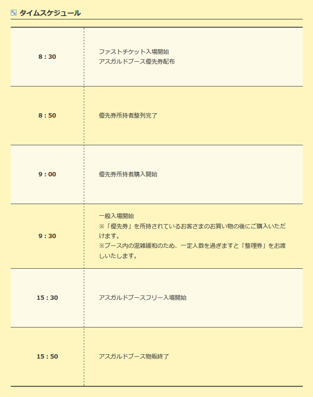 アスガルドブースの「優先券」「整理券」の簡単なタイムスケジュールはこちら!