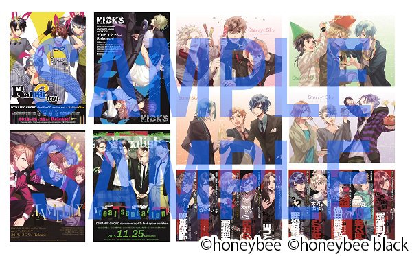 絵柄は「DYNAMIC CHORD」よりRabbit Clan、KICKS、TAMELILY、apple-polisherの4種、「Blackish House」から2種、「Starry☆Sky」から4種の計10種です。
