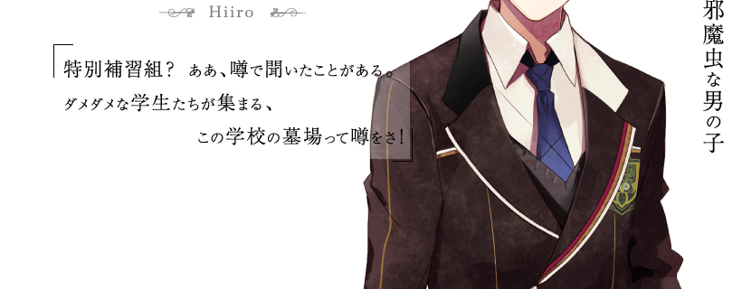 成績優秀生徒。自分に絶対的な自信を持っている。 何かと補習組メンバー達を敵視しては、突っかかって邪魔をしてくる。 意地の悪い性格。