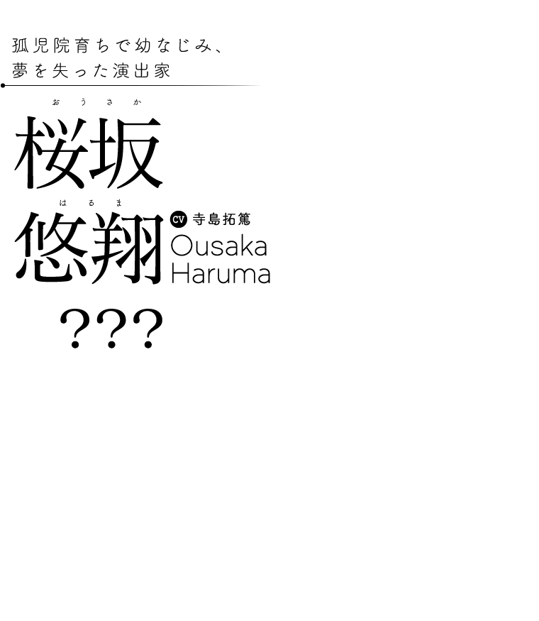 ヒロインと同じ孤児院出身で、幼なじみ。元は役者志望だったが、とある事故で足を悪くしてしまい、夢を断念。代わりに演出家として舞台の世界に関わる道を選んだ。そんな過去を感じさせないほど本人の性格は前向きで、逆境を楽しむポジティブさすら持つ。