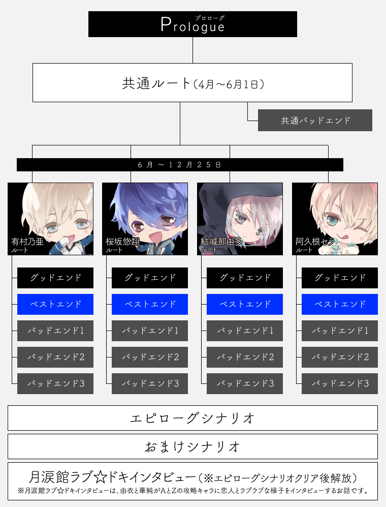 Blackish House ←sideZのシナリオは下の図のような構成になっております。 共通ルートで特定の条件を満たすことにより、各アーティストの個別ルートへ進めます。