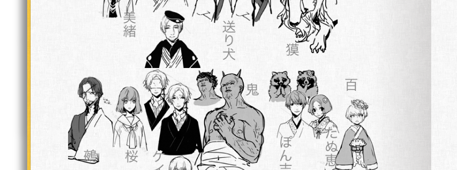 最初にカズアキさんに提出して頂いた、サブキャラクターのラフです。 このラフの中から、相談を重ねて今の形になりました。